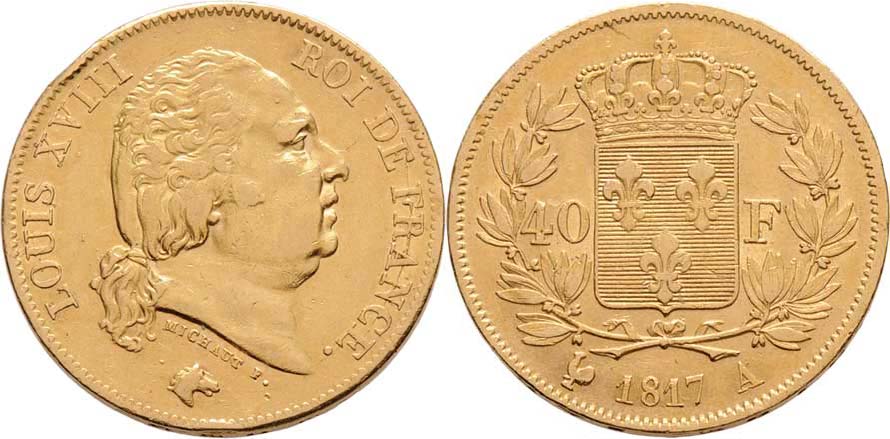 40 Frank 1817 A, Paříž, KM.713.1 (Au900, pouze 90.000 ks), 12.811g, vada razidla, dr.hr., nep.rysky, pěkná patina
