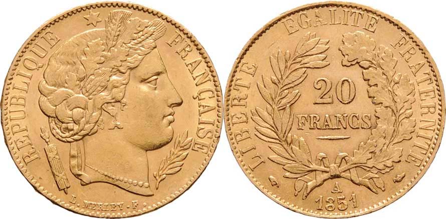 20 Frank 1851 A, Paříž, KM.762 (Au900), 6.422g, nep.hr., nep.rysky, pěkná patina, téměř