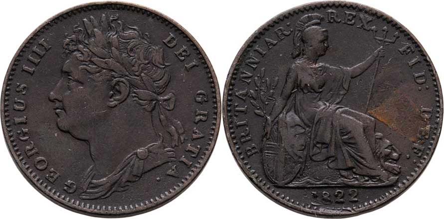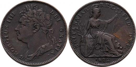 Farthing 1822, SCBC.3822, KM.677 (měď), 4.405g, nep.hr., nep.rysky, dr.vady materiálu v reversu, pat.