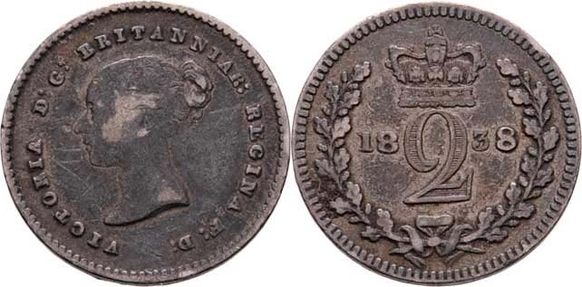 2 Pence 1838 - typ Maundy sets, KM.729 (Ag925), 0.925g, nep.hr., nep.rysky, pěkná patina