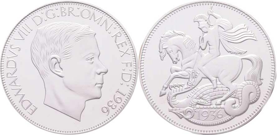 Crown 1936 - portrét, opis / svatý Jiří - pozdější ražba podle nevydaného návrhu mince, patrně postříbř. bronz, 40mm, 29.259g, kapsle