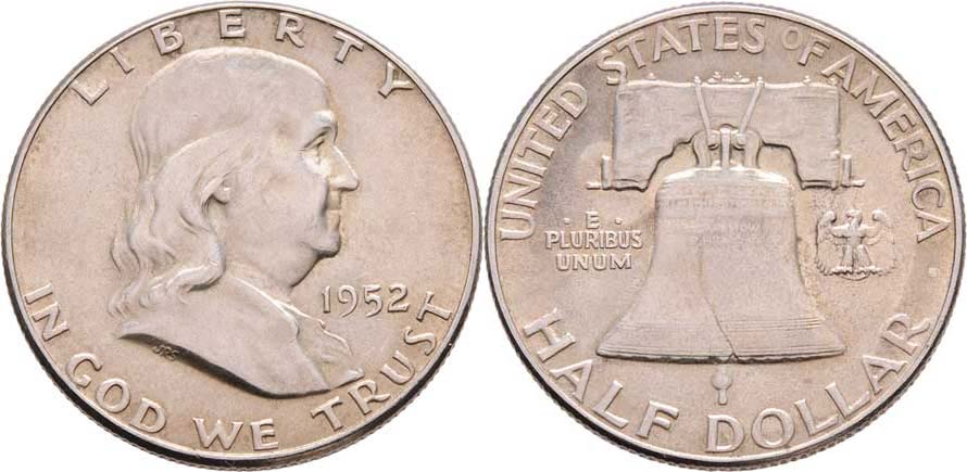 1/2 Dolar 1952 - Franklin, KM.199 (Ag900), 12.361g, nep.rysky, pěkná patina, téměř