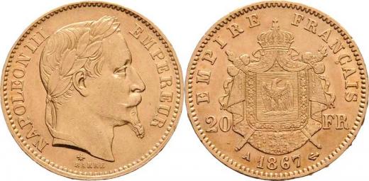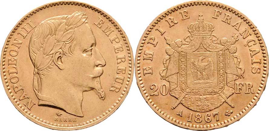 20 Frank 1867 A, Paříž, KM.801.1 (Au900), 6.442g, nep.hr., nep.rysky, pěkná patina, téměř