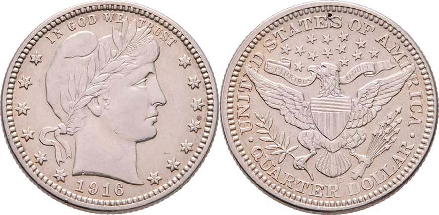 1/4 Dolar 1916 D - Barber, KM.114 (Ag900), 6.296g, nep.hr., nep.rysky, v reversu malý důlek, pěkná pat.