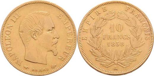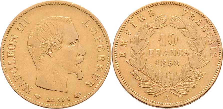 10 Frank 1858 A, Paříž, KM.784.3 (Au900), 3.186g, dr.hr., dr.rysky, nep.úhoz, patina