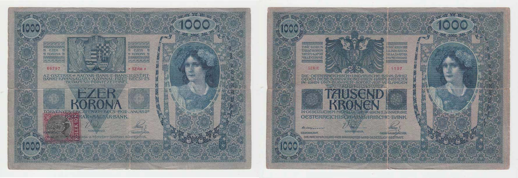 1000 Koruna 1902 - kolkovaná, série 1197, BHK.6, 2x natržená cca 20 mm
