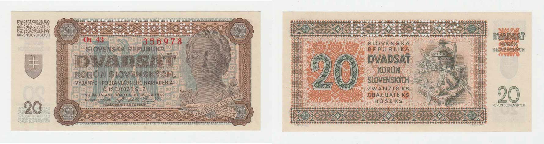 20 Koruna 1942, série Ot43, BHK.53b "SPECIMEN"
