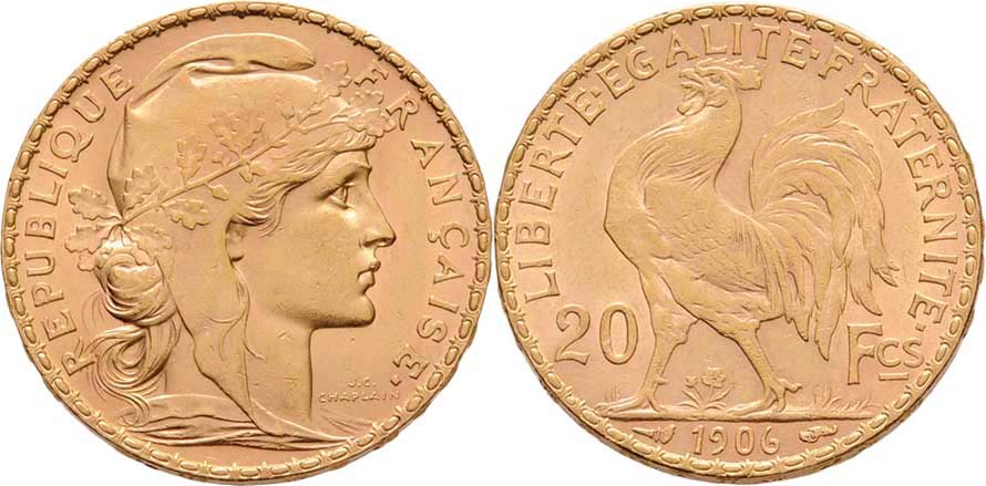 20 Frank 1906, Paříž, KM.857 (Au900), 6.452g, nep.hr., nep.rysky, pěkná patina, téměř