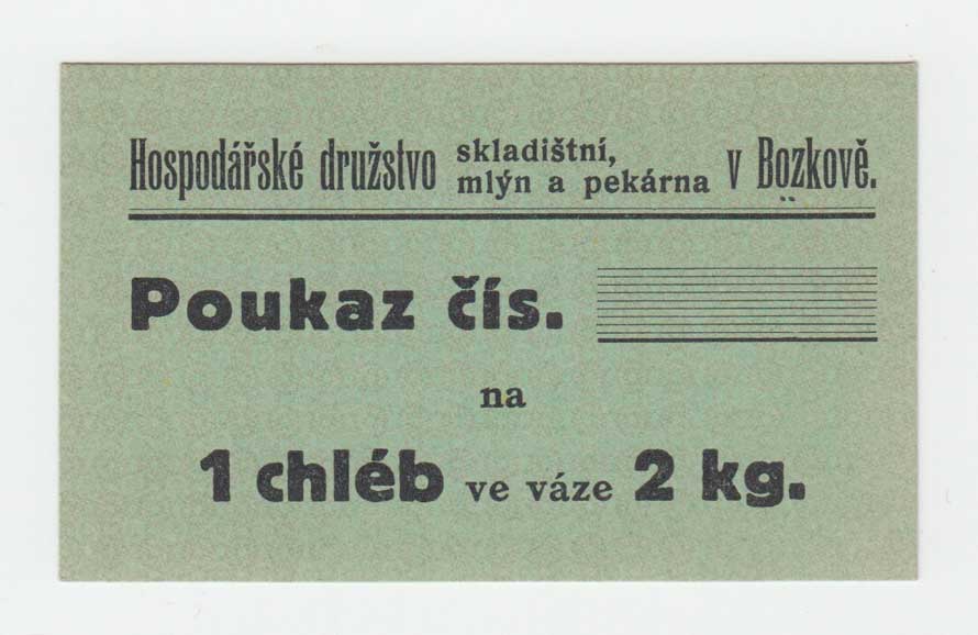 Bozkov, hospodářské družstvo - 2kg chleba - formulář, zelený karton 82x50 mm