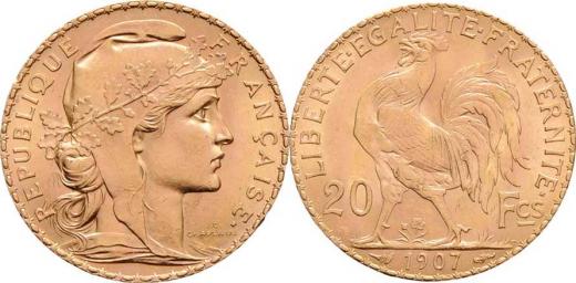 20 Frank 1907, Paříž, KM.857 (Au900), 6.461g, nep.hr., nep.rysky, téměř