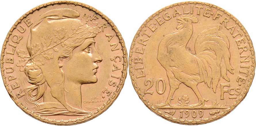 20 Frank 1909, Paříž, KM.857 (Au900), 6.438g, dr.hr., nep.rysky, nep.skvrnky, patina
