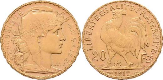 20 Frank 1912, Paříž, KM.857 (Au900), 6.478g, dr.hrana ražbou, nep.hr., nep.rysky, pěkná pat., tém.