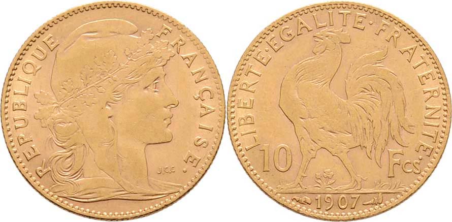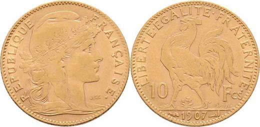 10 Frank 1907, Paříž, KM.846 (Au900), 3.217g, nep.hr., nep.rysky, pěkná patina