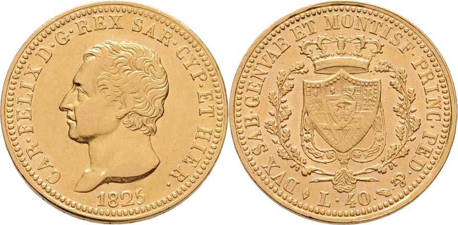 40 Lira 1825, L+orlí hlava, Torino, KM.107.1 (Au900, pouze 39.000 ks), 12.879g, nep.hr., nep.rysky R!