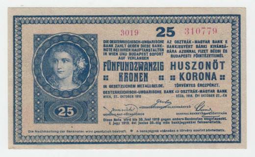 25 Koruna 1918, Pick.13, Ri.448b1 - sér.3019 - platná také na části území Slovenska okupované Maďarskou republikou rad