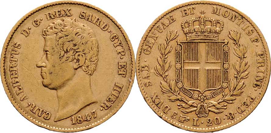 20 Lira 1847 P, orlí hlava, Torino, KM.115.2 (Au900, pouze 52.000 ks), 6.406g, nep.hr., nep.rysky, pat. R!