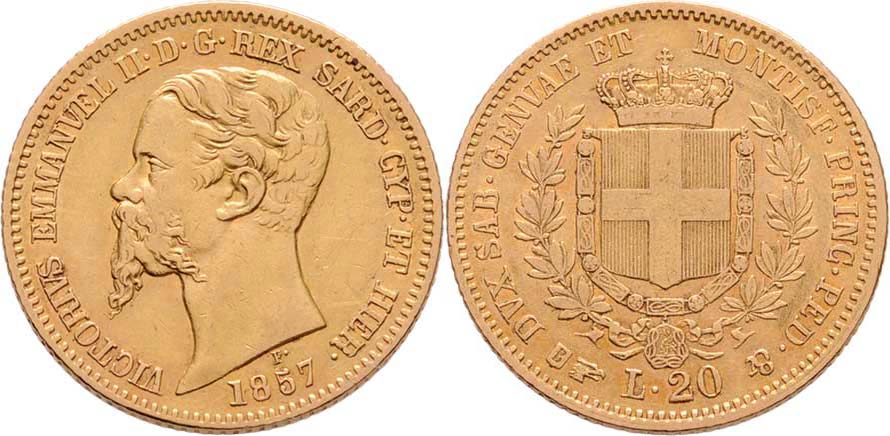 20 Lira 1857 B+orlí hlava, Torino, KM.126.2 (Au900, pouze 67.000 ks), 6.421g, nep.hr., nep.rysky, patina
