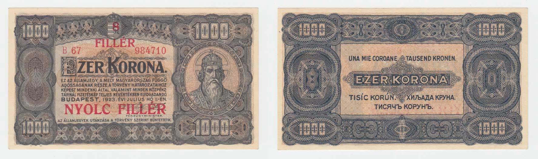 1000 Koruna 1923 - přetisk na 8 Filér, Pick.81b R!