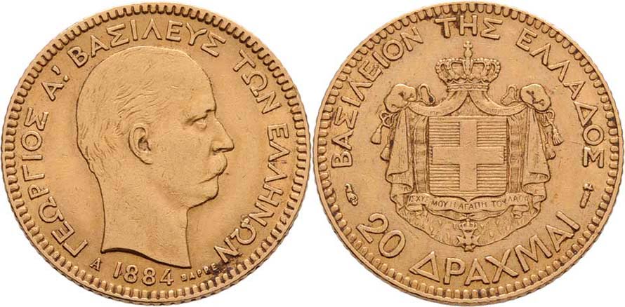 20 Drachma 1884 A, KM.56 (Au900), 6.438g, nep.hr., nep.rysky, skvrnky, patina