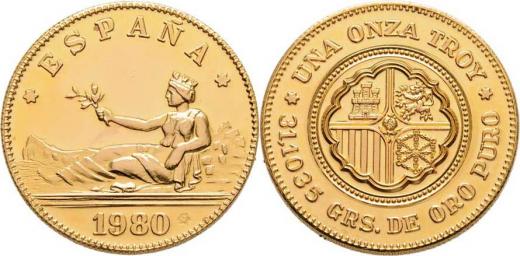 1 Unce 1980 - s motivem sedící Hispanie, KM.neuvádí (Au999), 31.102g, španělský punc, nep.úhozy