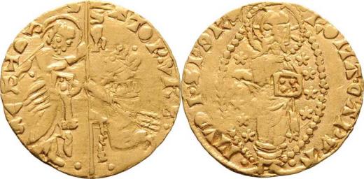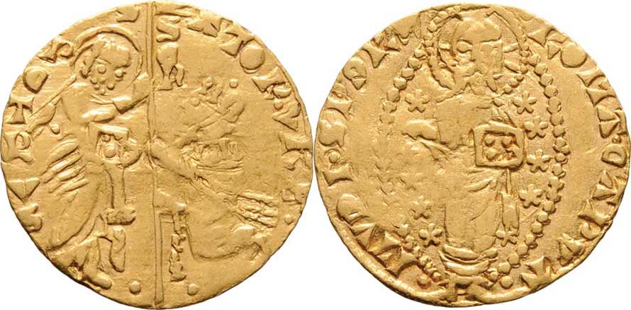 Dukát b.l., stojící Kristus se svatozáří, opis / princeps klečící před svatým Petrem, opis, Berm.150, De Wit.III.3733, Biaggi.2126, 3.475g, nedor., pat. R!