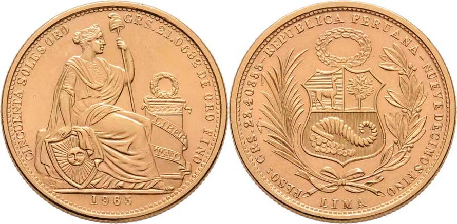 50 Soles 1965, KM.230 (Au900, pouze 23.000 ks), 23.363g, nep.rysky, pěkná patina R!