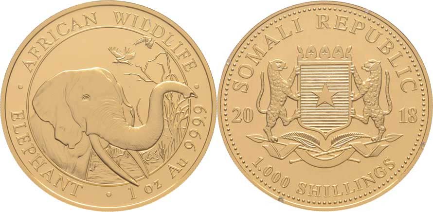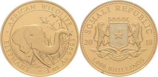 1000 Shillings 2018 - slon, KM.nové (Au999, 1 unce, 31.11g), kapsle RR!