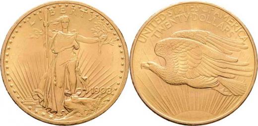20 Dolar 1908 - stojící Liberty, KM.127 (Au900), 33.436g, nep.hr., nep.rysky, pěkná patina