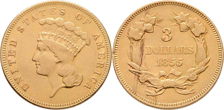 3 Dolar 1855 - hlava indiána, KM.84 (Au900, pouze 50.555 ks), 4.991g, dr.hr., dr.rysky, nep.zvlněný, pěkná patina RR!