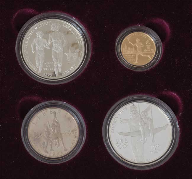 Sada pamět. mincí 1995 - LOH Atlanta 1996 - 5 Dolar (Au900), 2x 1 Dolar (Ag900), 1/2 Dolar (CuNi/Cu), KM.257,259,260,261, 4x kapsle, společná etue, přebal