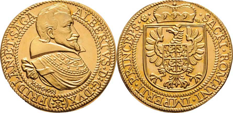 Válková - Albrecht z Valdštejna - pětidukát 1993 - poprsí zprava, opis / frýdlantský znak, opis, Sign., Punc., Au987, 28mm, 16.943g, nep.exc. RR!