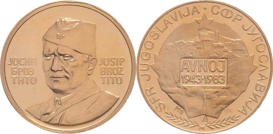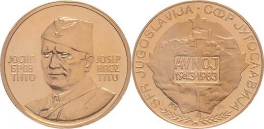 J.B.Tito - AVNOJ 1943/1983 - poprsí v uniformě mírně zleva / hvězda, pohled na město, nápis a opis, 3x Punc., Au900, 23mm, 6.478g