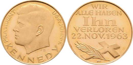 J.F.Kennedy - dukátová úmrtní medaile 22.XI.1963 - hlava zleva, opis / kříž, palmová ratolest a nápis, Sign.FB, Punc., Au900, 20mm, 3.476g