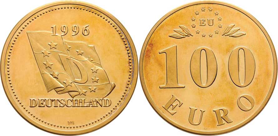 Medaile "100 Euro 1996" - prapor, nápis / emblém EU, nápis, Nesign., Punc., Au585, 40mm, 19.813g, nep.rysky