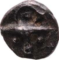 AR Obol - typ Athéna Alkidémos - hrbol ve tvaru štítu / silně barbarizovaný obraz kráčející Athény, 8mm, 0.761g, G-K.78.31, Ziegaus.501, tmavá patina R!