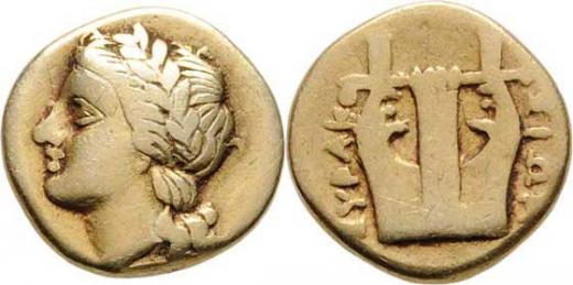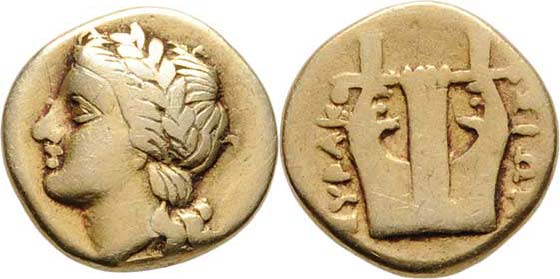 25 Litra, hlava Apolóna zleva / lyra, opis, SG.958, BMC.2.266, Hoover.2.1295 (datuje 310 - 300 př.Kr.), 1.786g, nep.exc., nep.rysky, pěkná patina RR!