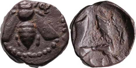AR Diobol, včela a monogram / dvě hlavy jelenů proti sobě, monogramy, SG.4375, 0.952g, mírně exc., nep.nedor., tmavá patina R!