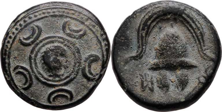 AE 16mm, Makedonský štít s hlavou Gorgony/ makedonská helmice, caduceus a monogram, podobný jeko SG.6782, 3.788g, nep.exc., krásná patina