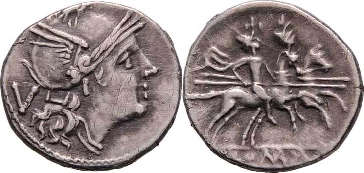 AR Quinár, Hlava Roma zprava, zn."V" / Dioscuriové na koních zprava, nápis "ROMA.", Crawford.48/1, Alb.162, neznámá italská mincovna, vlas.rysky, patina