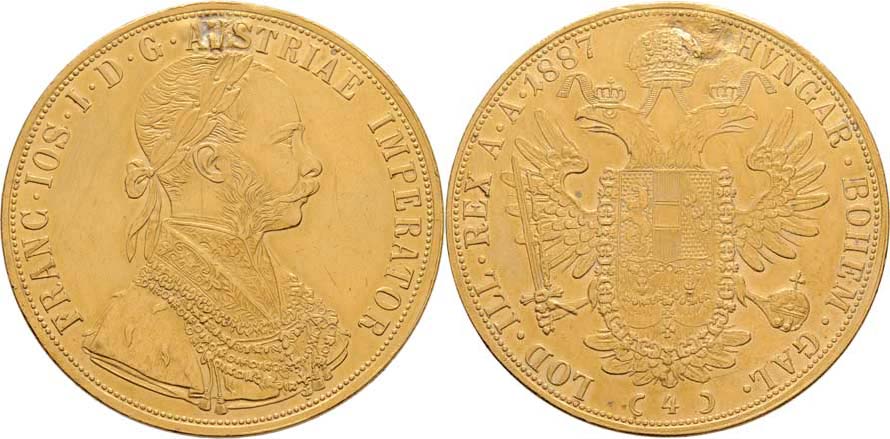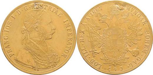 4 Dukát 1887 (pouze 26.947 ks), 13.875g, stopa po závěsu, dr.hr., vlas.rysky, patina