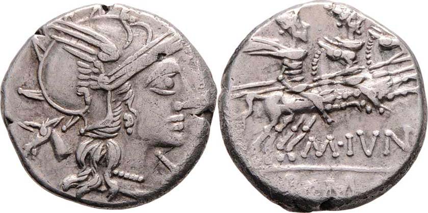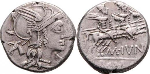 AR Denár, Hlava Romy zprava, zn."X" / Dioscuriové na koních zprava, nápis "M.IVNI.ROMA.", Crawford.220/1, Alb.874, Seaby.Junia.8, nepravidel.okraj, pěkná pat.