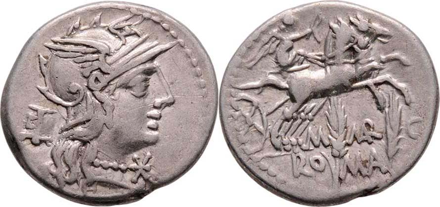 AR Denár, Hlava Romy, modius, zn."X." / Victoria na bize doprava, dva obilné klasy, nápis "M.MARC.ROMA.", Crawford.245/1, Seaby.Marcia.8, Alb.940, patina
