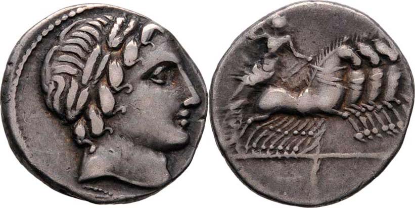 AR Denár, Hlava zprava / Jupiter na quadrize, bez nápisu, Crawford.350A/2, Alb.1223, nep.exc., patina