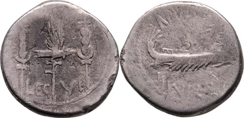 AR Denár, orel mezi standartami, nápis "LEG.VI." / galéra a opis "ANT.AVG.III.VIR.R.P.C.", Seaby.33, Crawford.544/19, Alb.1720, exc., nedor., škr., patina