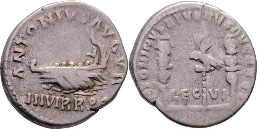 AR Denár, Av: "ANTONINVS.AVGVR.III.VIR.P.P." galéra / "ANTONINVS.ET.VERVS.AVGG.REST." orel mezi standartami S.350, RIC.443, nepravidelný okraj, pěkná patina R!