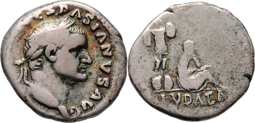 AR Denár, Rv:"IVDAEA.", zajatý žid sedí pod trofejí, podobný jako S.677, RIC.15 - minc. Řím - ražba z let 69 - 71, mírně exc., mírně nedor., patina R!