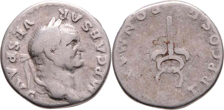 AR Denár, Rv:"PON.MAX.TR.POT.COS.V.", okřídlený caduceus, S.678, RIC.73 - mincovna Řím - ražba z roku 74, nedor., patina