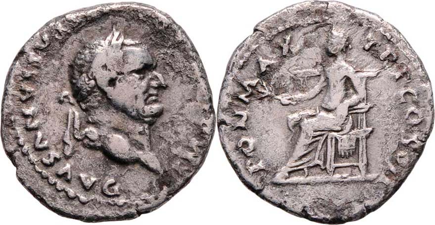 AR Denár, Rv:"PON.MAX.TR.POT.COS.VII.", sedící Pax, podobný jako S.680, RIC.101 - mincovna Řím - ražba z roku 76, mírně exc., mírně kor., patina