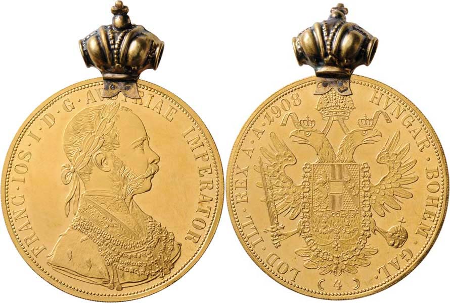 4 Dukát 1908 - se závěsem ve tvaru korunky, celková hmotnost 14.963g, nep.hr., nep.rysky, téměř R!