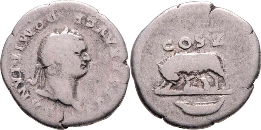 AR Denár, Rv:"COS.V." vlčice zleva s Romulem a Remem, S.773, RIC.241 - mincovna Řím - ražba z let 77 - 78, nepravidelný okraj střížku, nedor., patina